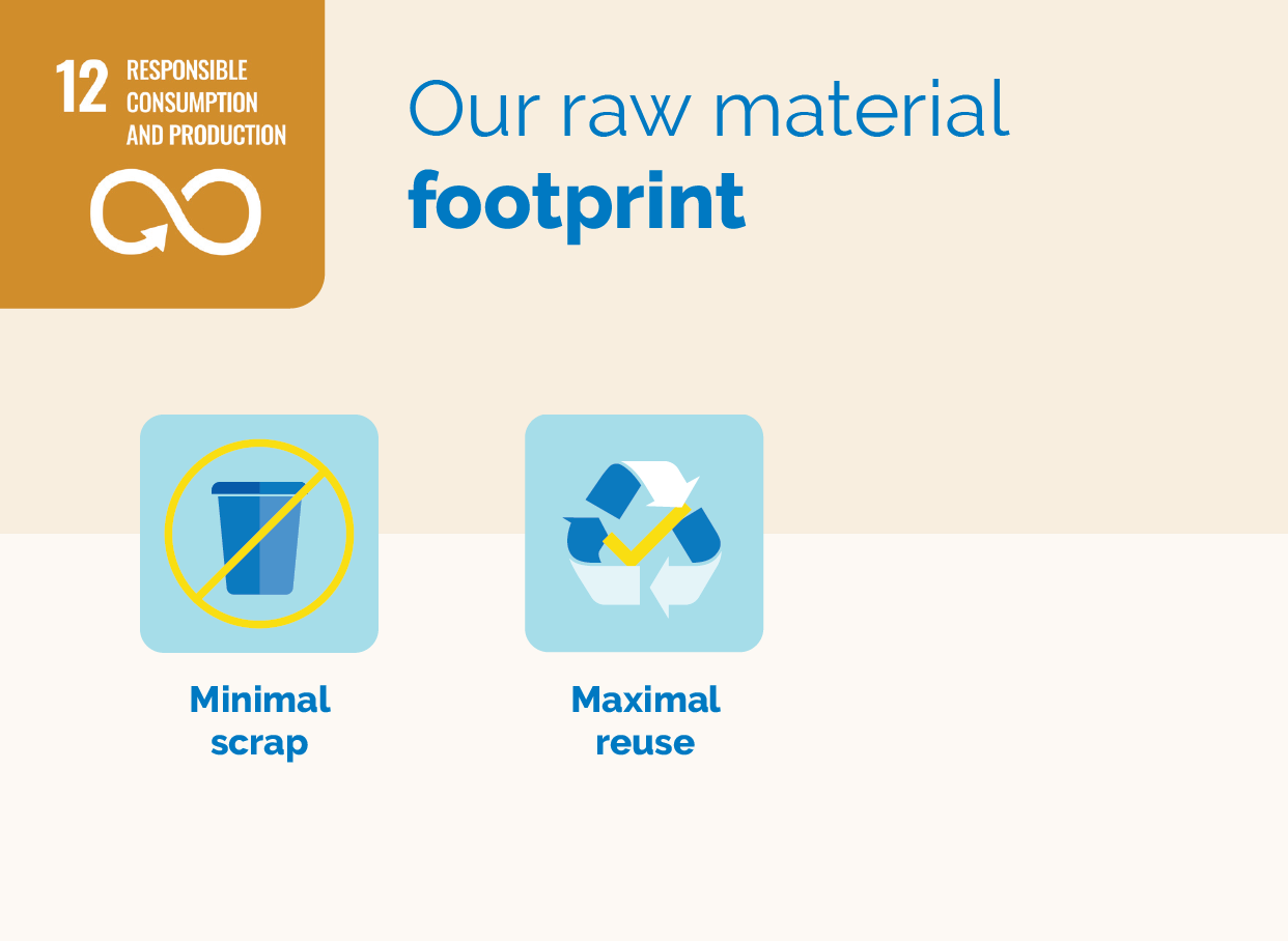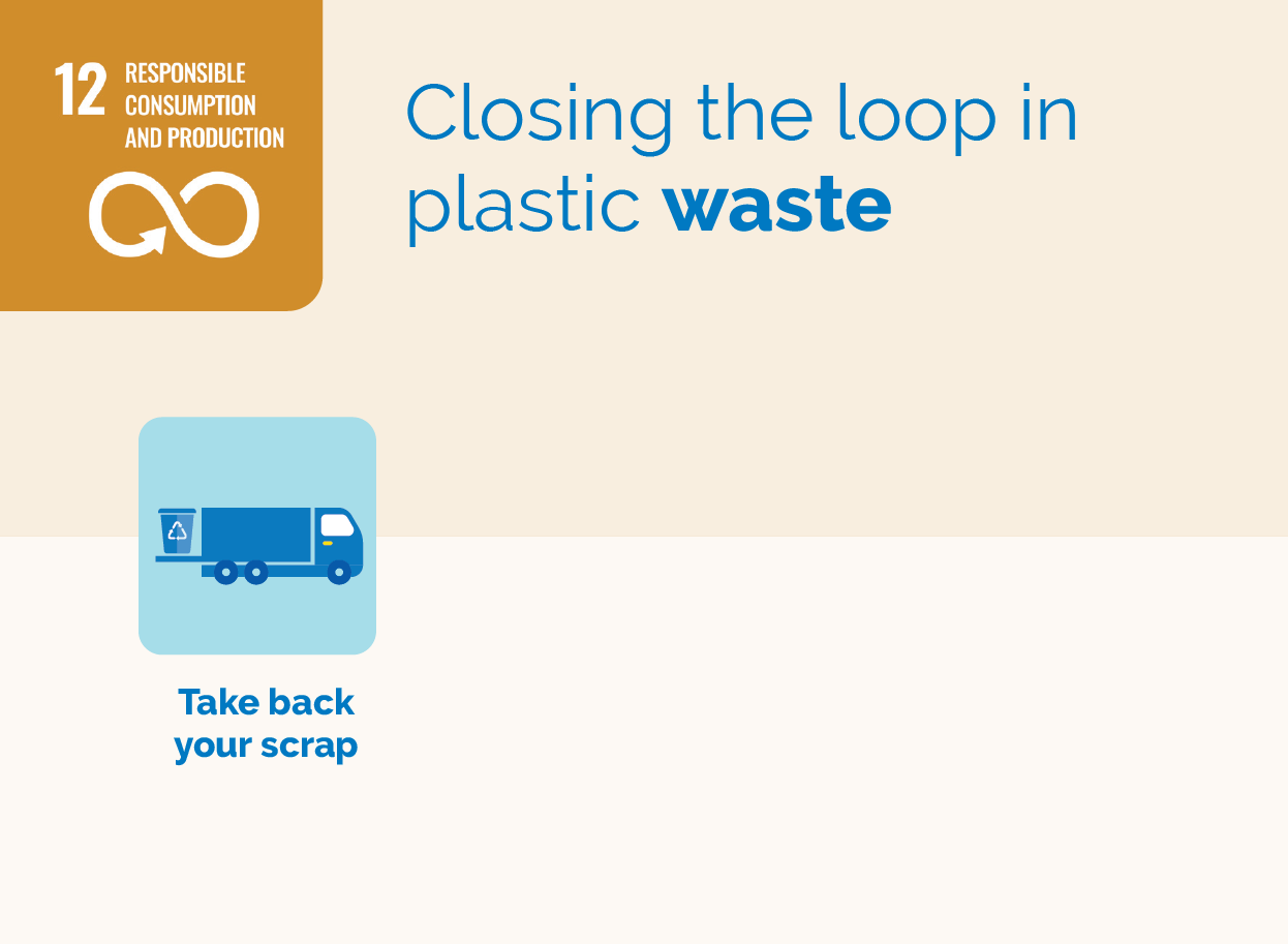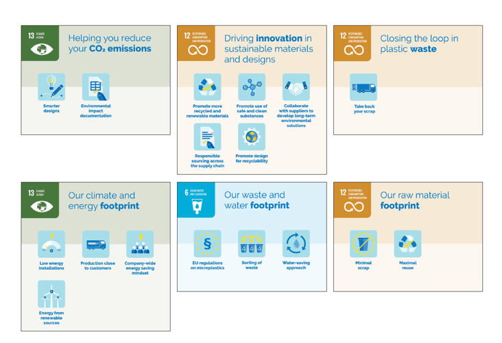 - unseren Kunden dabei zu helfen und sie dabei zu unterstützen, (noch) nachhaltigere Produkte herzustellen. Um dies zu fördern, werden wir intelligentere Designs sowie recycelte und biologisch abbaubare Rohstoffe anbieten und gemeinsam mit Kunden und externen Partnern daran arbeiten, Produktionsabfälle zu recyceln.